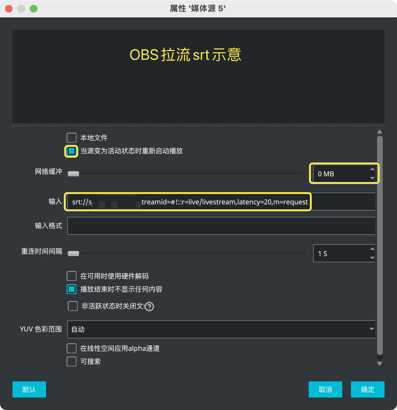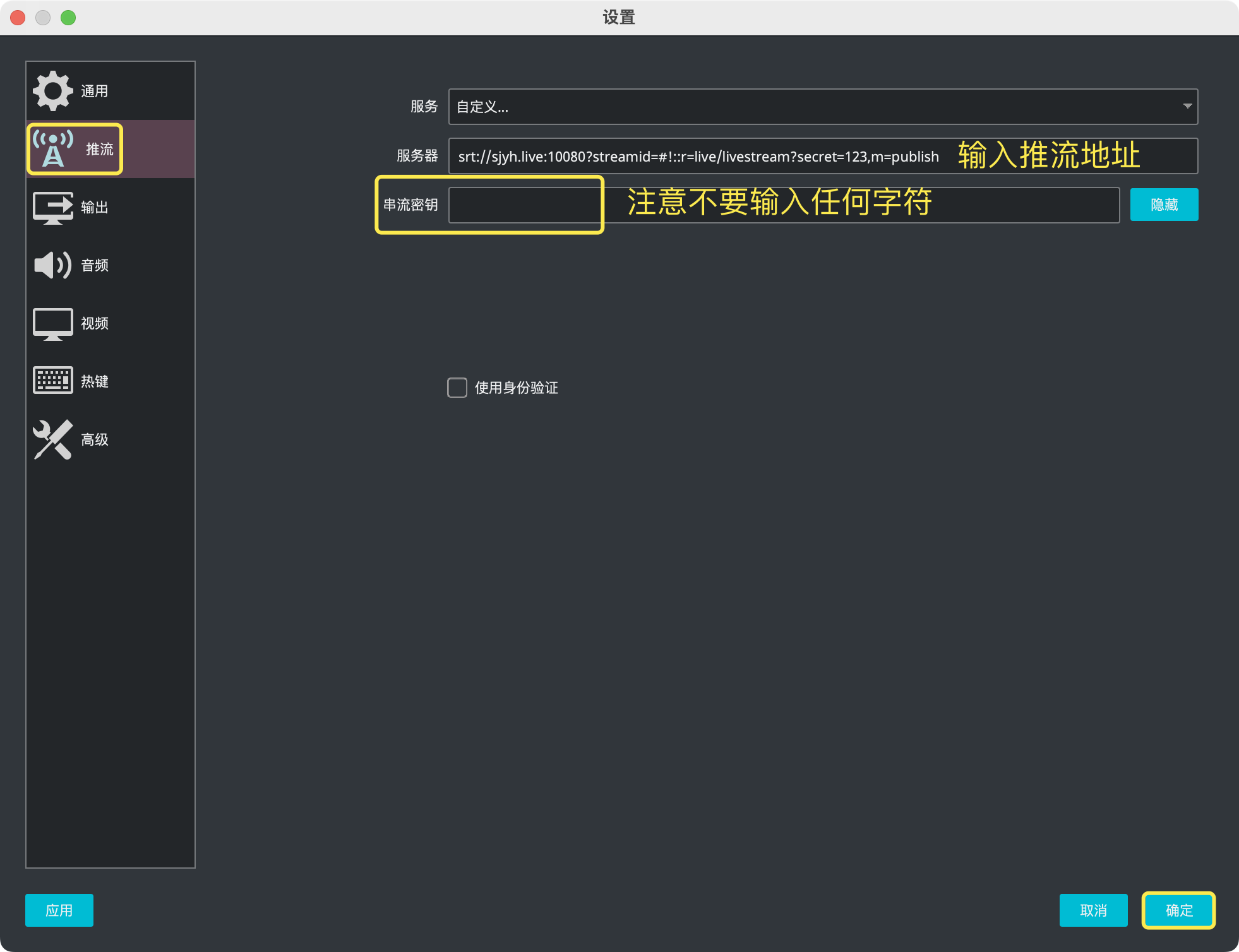 超清实时直播,指码率很高(测试过2~8Mbps),延迟很低(200~500ms)且无累计延迟的直播。可应用的具体场景包括不限于以下场景: 1.超高清视频会议,使用专业导播台,把直播流投屏到大屏,注意需要专门的硬件做降噪和回声消除;2.远距离和弱网推流直播,比如跨国推流,注意推RTMP后并不使用SRT播放而是普通直播播放(HTTP-FLV/HLS/WebRTC);3.远程制作和导播,户外直播用手机或摄像头推流到本服务器,用OBS/vMix/芯象制作后再播出,编辑不用在直播现场。4.多个会场连线。